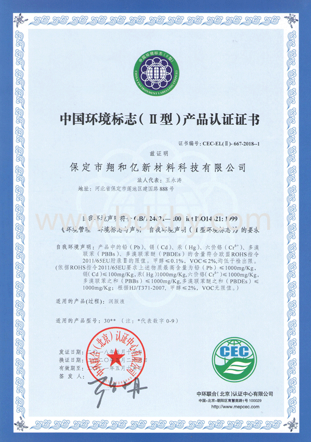 我公司于2018年5月通過中環聯合(北京)認證中心對我公司嚴格審查,認證通過并獲得《中國環境標志(II型)產品認證證書》
